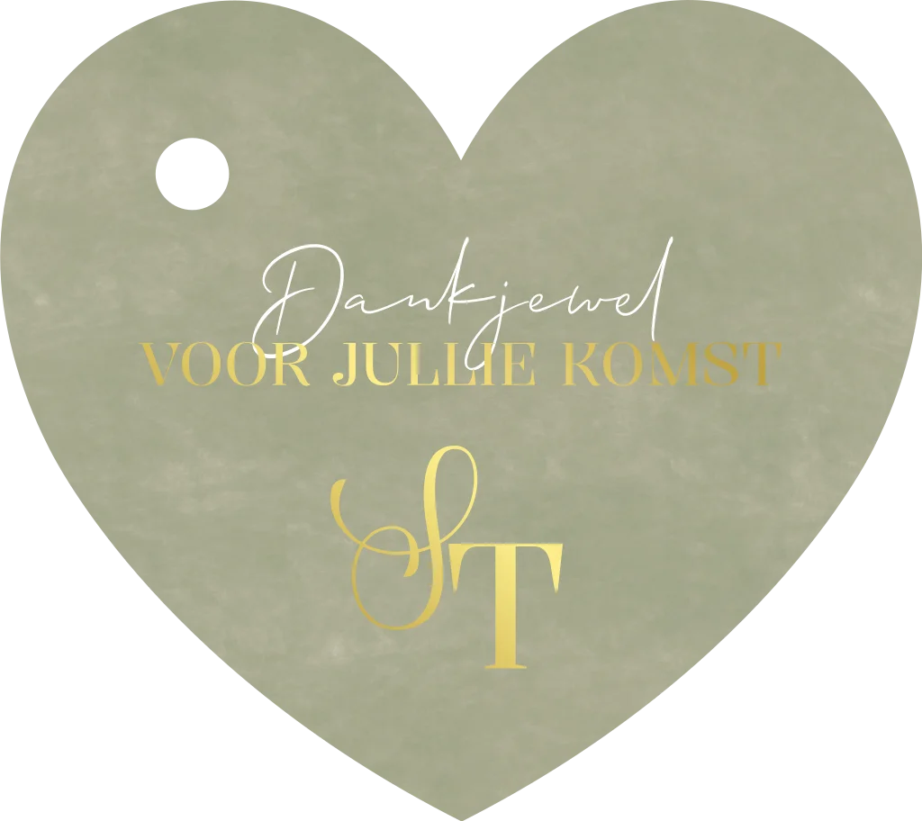 Een stijlvol en persoonlijk label in de Olive and Gold stijl, perfect om jullie bedankjes een luxe finishing touch te geven. De zachte olijfgroene tint in combinatie met goudfolie zorgt voor een warme en elegante uitstraling.