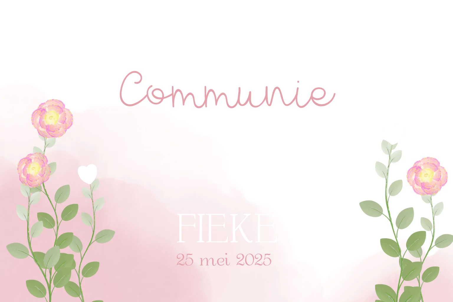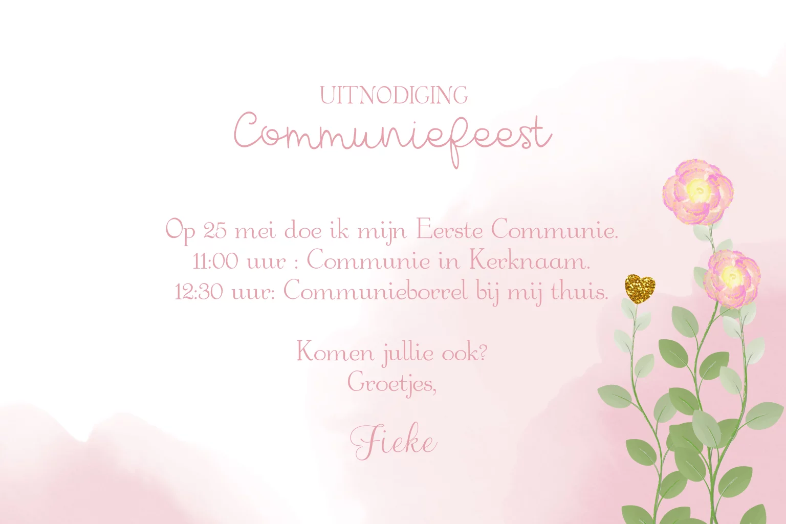 Communie of lentefeest uitnodiging met eenzijdige goudfolie bedrukking. Dit fleurige, lieve kaartje met roze waterverf , bloemen en goudfolie hartjes kan gemakkelijk worden aangepast.