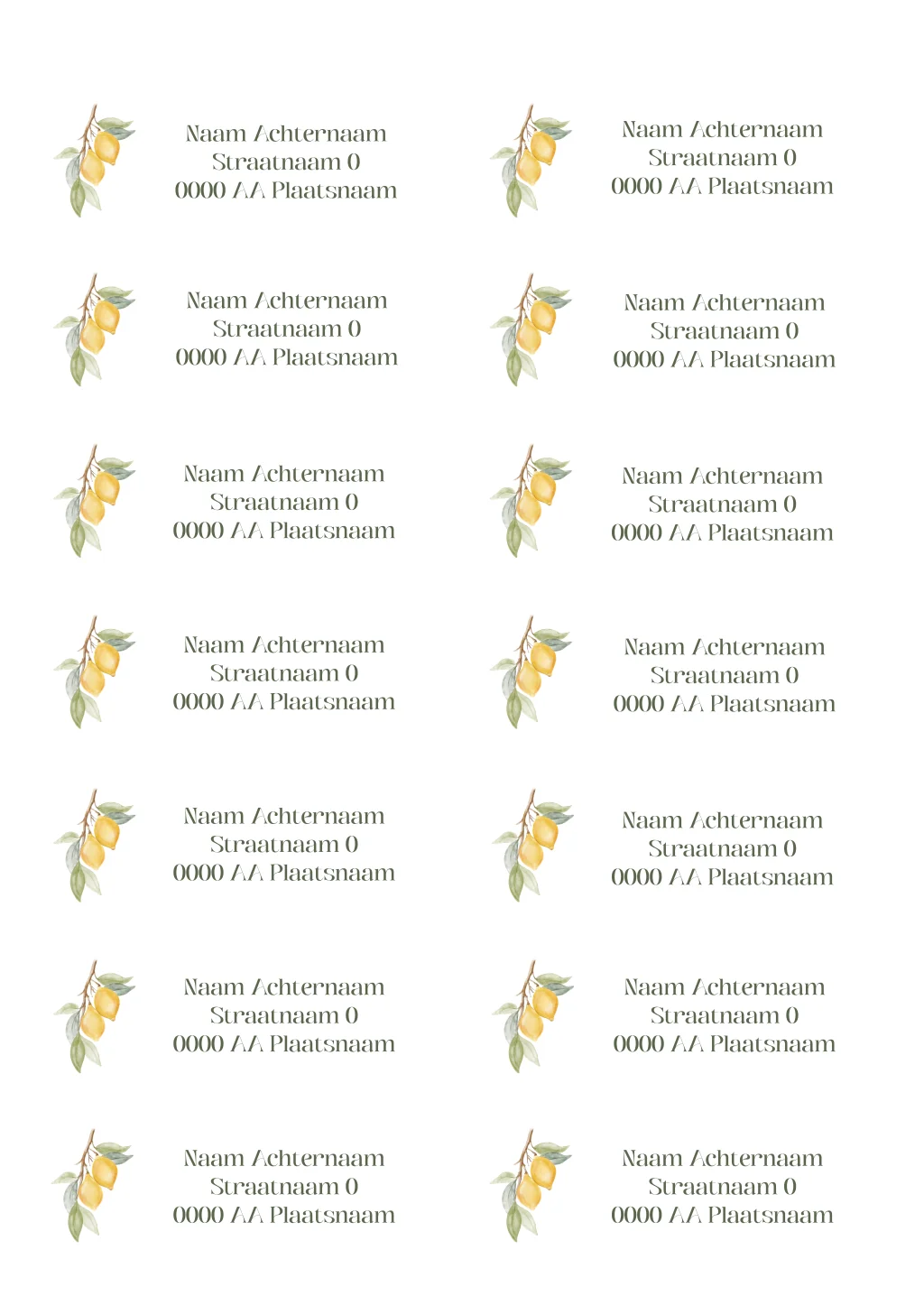 Maak iedere envelop extra bijzonder met deze stijlvolle adresstickers uit de Lemon Love collectie. De verfijnde illustratie met subtiele citroenen en sierlijke lettertypes geeft jullie post een frisse, elegante uitstraling.