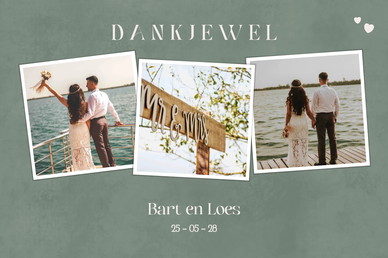 Bedank jullie gasten op een bijzondere manier met deze stijlvolle bedankkaart met ronde hoeken. De kaart heeft ruimte voor drie foto’s, perfect om speciale momenten van jullie bruiloft te delen. De groene achtergrond met een subtiel structuurtje voegt een elegante touch toe.