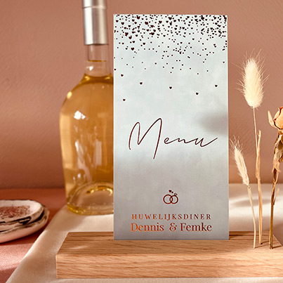 Stijlvolle menukaart voor een huwelijksdiner. Deze mooie menukaart heeft een grijsgroene velvet achtergrond met hartjes en tekst in goudfolie gedrukt. Je kunt deze menukaart zelf naar wens aanpassen en zo maak je zelf een menukaart voor jullie huwelijksmenu.