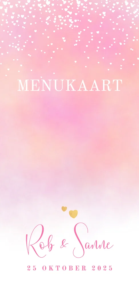 Presenteer jullie culinaire meesterwerken op elegante wijze met deze prachtige menukaart". De lichtroze achtergrond, verfraaid met verfijnde witte hartjes en een vleugje geel, brengt een subtiele sfeer van romantiek naar de eettafel.