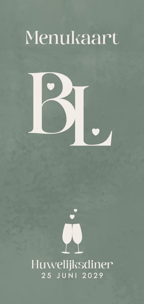 Maak jullie huwelijksdiner compleet met deze stijlvolle menukaart, ontworpen in dezelfde verfijnde stijl als onze trouwkaart. De vergrijsde groene achtergrond en fluweelachtige structuur geven de menukaart een luxe uitstraling. De kaart kan volledig naar wens worden aangepast met jullie persoonlijke menu, zodat het perfect aansluit bij de sfeer van jullie grote dag.
