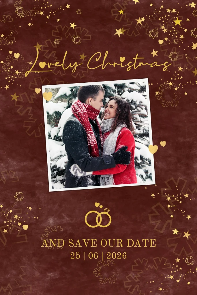 Deze stijlvolle en luxe Save the Date kerstkaart is de perfecte manier om jullie belangrijke datum bekend te maken aan jullie geliefden. Laat de prachtige donker roodbruine kleur en de goudkleurige details jullie liefdesverhaal stralen tijdens de feestelijke kerstperiode.