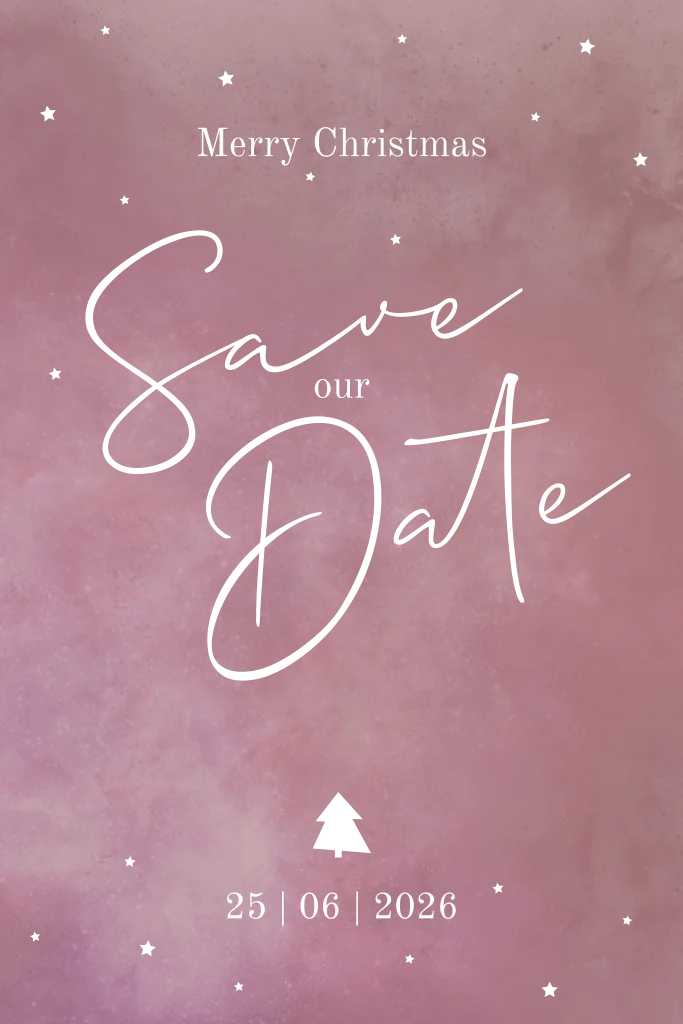 Bekijk onze prachtige save the date kerstkaart met ronde hoeken en prachtige goudfolie bedrukking. Deze unieke kaart is voorzien van een stijlvolle roze gemêleerde achtergrond, wat een elegante en trendy uitstraling geeft.