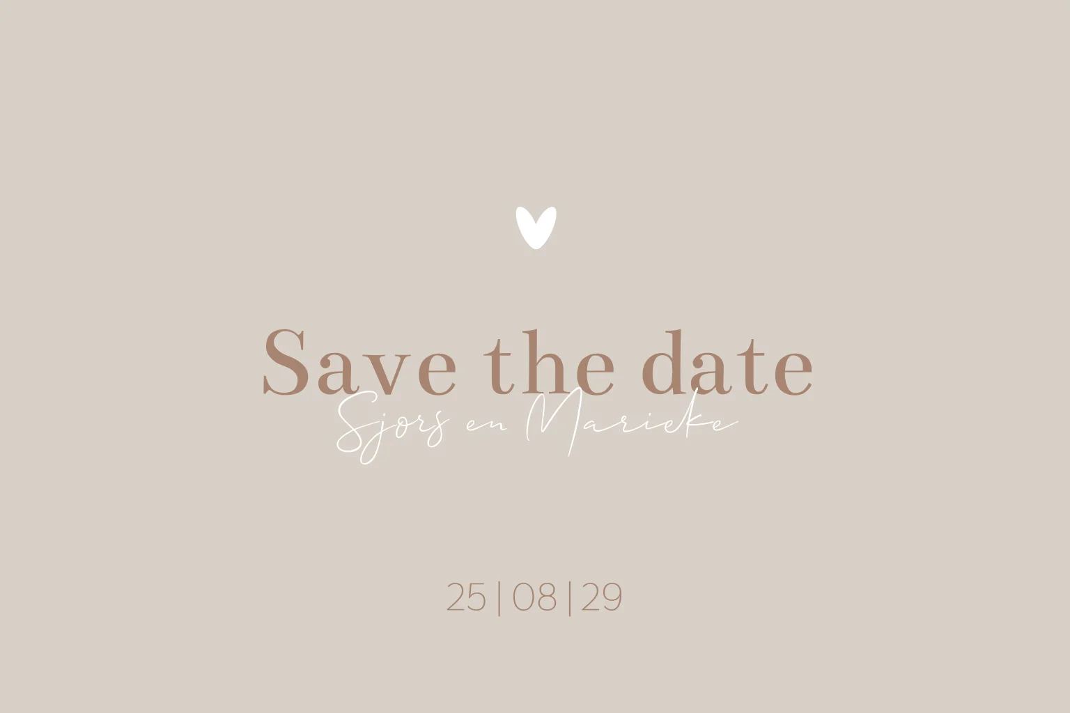 Laat jullie grote dag op een stijlvolle manier aankondigen met deze minimalistische Save the Date kaart in een warme mokka beige tint. De zachte, neutrale kleur en het subtiele hartje geven de kaart een rustige en elegante uitstraling.