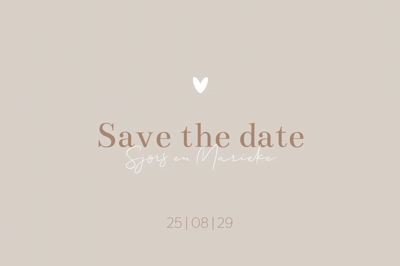 Laat jullie grote dag op een stijlvolle manier aankondigen met deze minimalistische Save the Date kaart. De zachte, neutrale tinten en afgeronde hoeken geven de kaart een natuurlijke en elegante uitstraling. In het midden springt de boodschap ‘Save the Date’ eruit, subtiel aangevuld met een klein hartje erboven. De namen en datum zijn strak en verfijnd geplaatst, waardoor het geheel rust en harmonie uitstraalt. Deze kaart past perfect bij een moderne, romantische bruiloft en kan volledig naar wens worden aangepast. Bestel een proefdruk en ontdek zelf de warme en tijdloze uitstraling!