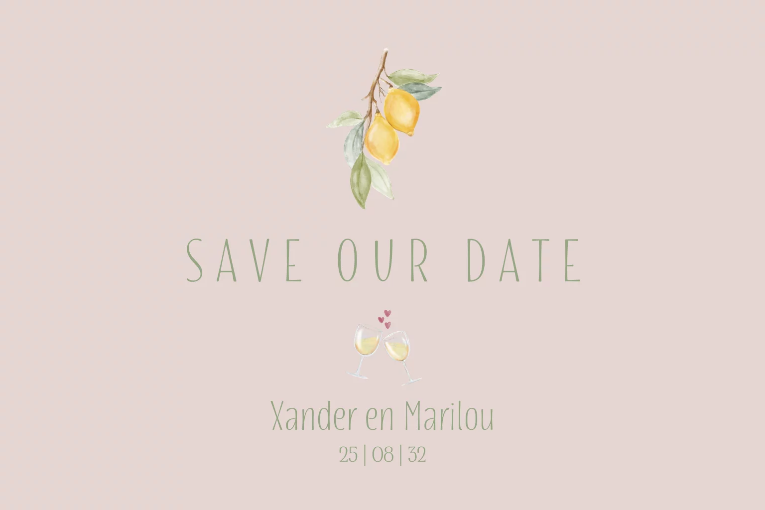 Breng een vleugje mediterrane sfeer in jullie trouwaankondiging met deze elegante Save the Date kaart. De zachte achtergrond en afgeronde hoeken zorgen voor een warme, natuurlijke uitstraling. In het midden staat ‘Save the Date’, met daarboven een sierlijke illustratie van een citroentak met twee citroenen – een symbool van liefde en frisheid. Onderaan voegen twee klinkende wijnglazen met kleine hartjes een speelse en feestelijke touch toe. Perfect voor een bruiloft met een romantische en ontspannen sfeer! Pas de kaart eenvoudig aan en bestel een proefdruk om het ontwerp in het echt te zien.