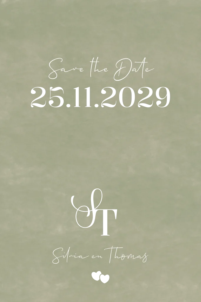 Laat jullie trouwdatum op een stijlvolle manier vastleggen met deze elegante Save the Date kaart uit de Olive and Gold collectie. De kaart is ontworpen in een warme olijfgroene tint met een verfijnde gemêleerde structuur en glanzende goudfolie accenten.