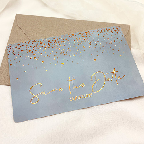 Breng familie en vrienden tijdig op de hoogte van jullie trouwdatum met deze schitterende Save the Date kaart. De kaart heeft een stijlvolle grijs-groene velvet-look, versierd met vele hartjes in luxe goudfolie. Deze prachtige kaart is niet alleen een voorproefje van jullie grote dag, maar is ook beschikbaar in een bijpassende trouwkaart en menukaart, zodat jullie de perfecte trouwcollectie kunnen samenstellen.