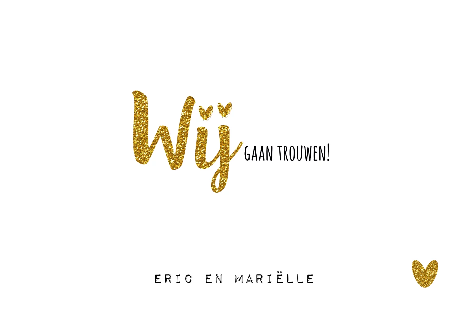 Moderne Save the date kaart. Witte kaart met een goudkleurige glitter tekst en hartjes. De witte achtergrondkleur kan worden aangepast. (geen goudfolie of echte glitters.)
