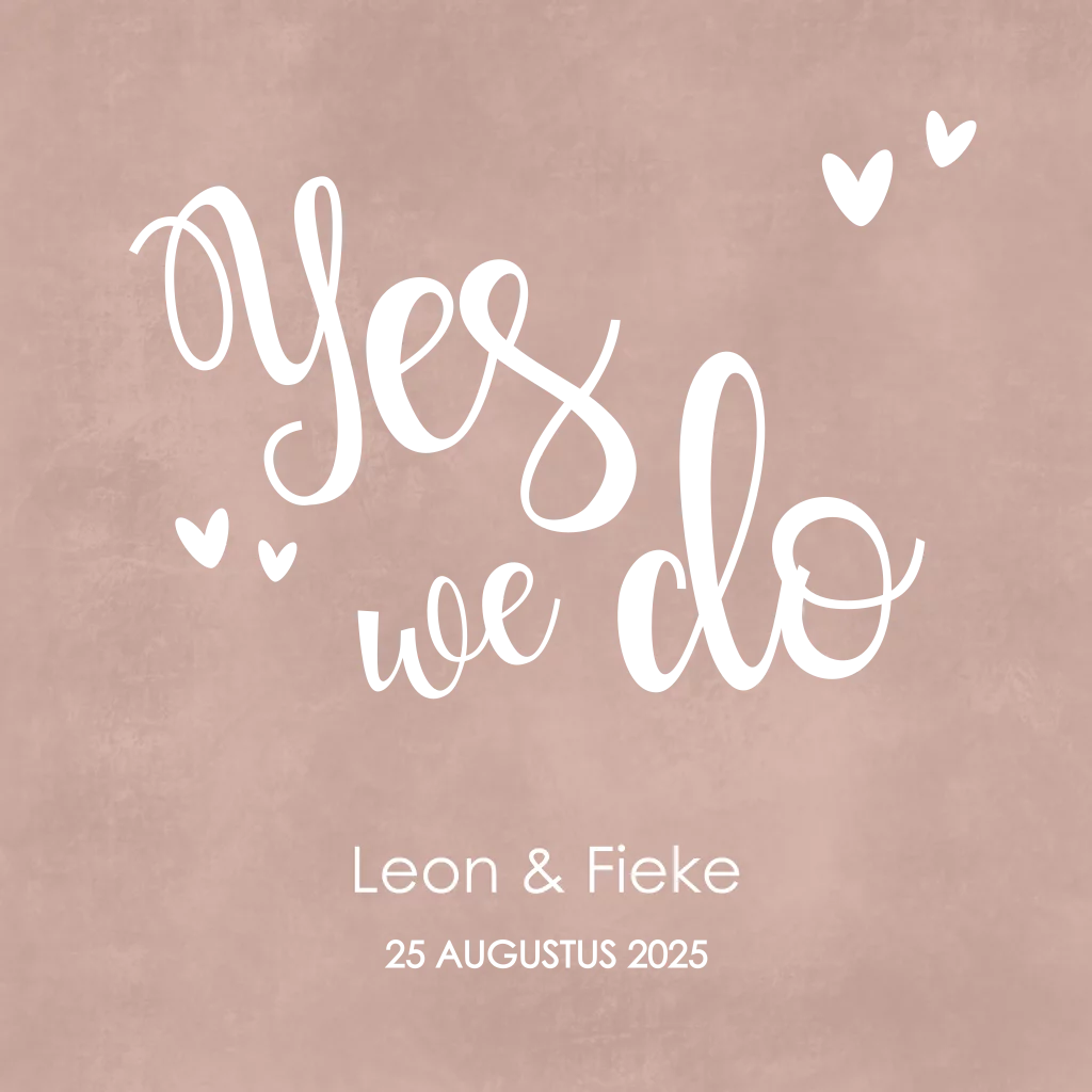 Onze trouwkaart is een meesterwerk van elegantie en speelsheid. De oudroze velvet look straalt warmte uit, terwijl de tekst met rosé-goudfolie accenten en hartjes een speelse chique toevoeging vormt.