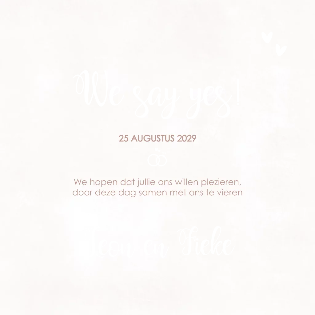 Deze kaart is volledig aanpasbaar naar jullie wensen. Personaliseer de tekst, kies je favoriete lettertypes en kleuren om het een weerspiegeling te maken van jullie liefde. Bovendien bieden we de mogelijkheid om een proefdruk te bestellen, zodat je zeker bent van het perfecte resultaat.