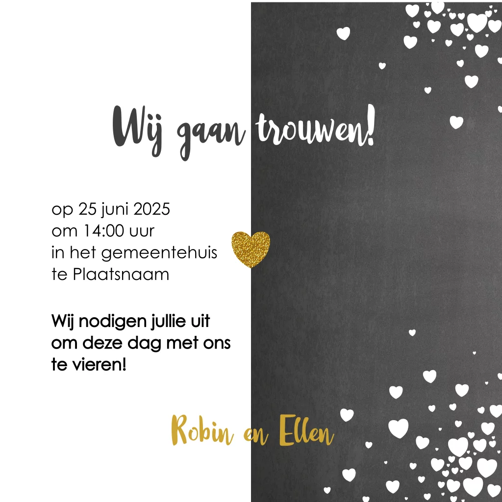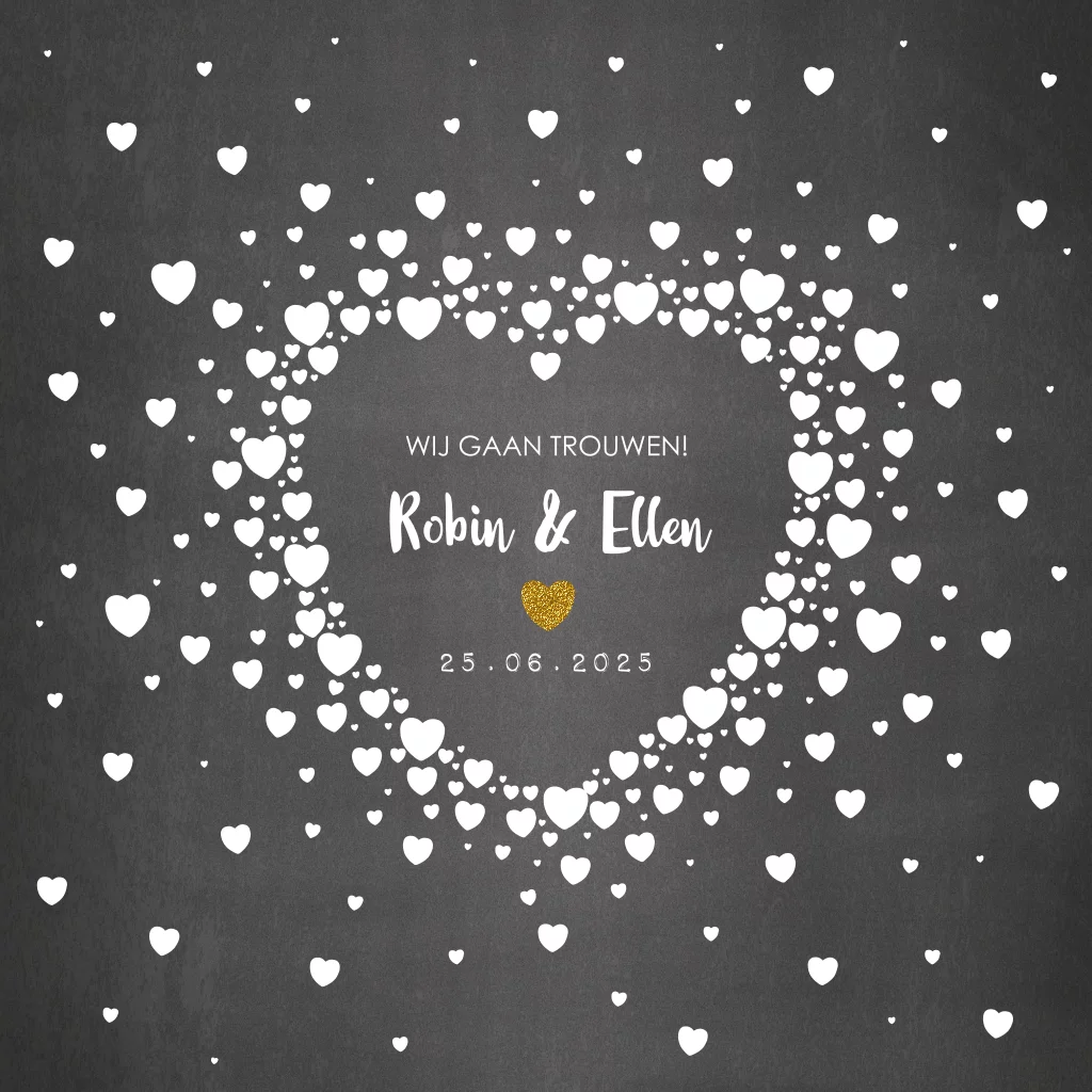 Hippe trouwkaart met een krijtbord achtergrond, vele witte hartjes en goudkleurige glitter hartjes. (geen goudfolie of echte glitters)