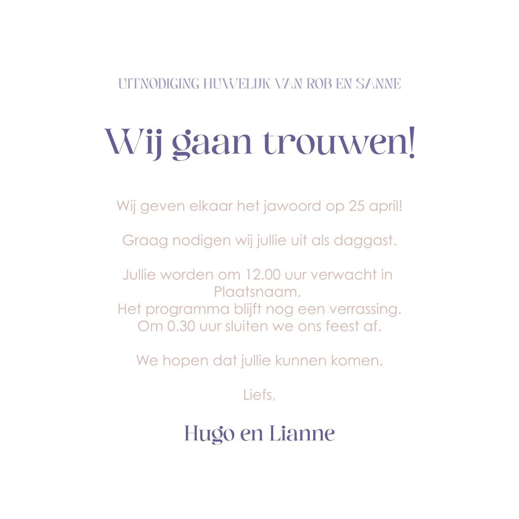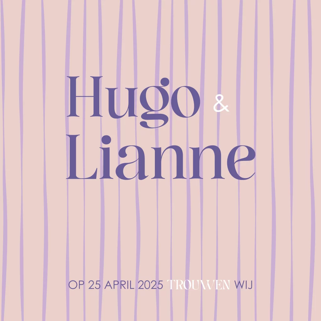 Vier jullie liefde met onze stijlvolle trouwkaart met een eigentijds design in licht oudroze, versierd met lila strepen en teksten in diep donkerpaars. Volledig aanpasbaar naar jullie wensen, inclusief kleuraanpassingen. Bestel een proefdruk en ervaar de elegantie. Maak het uniek, net als jullie liefdesverhaal.
