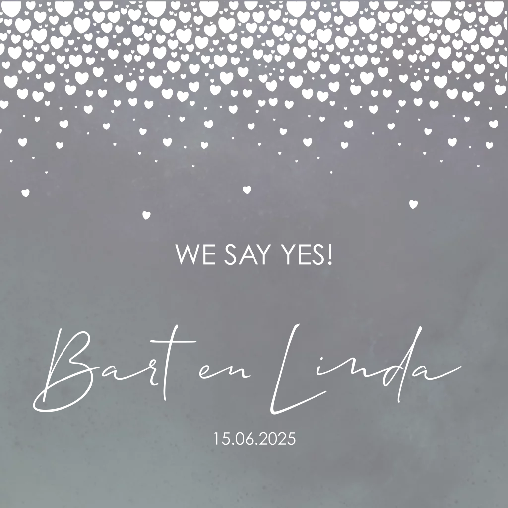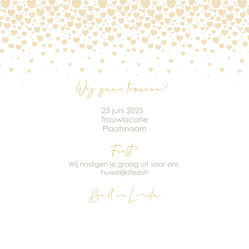 Stijlvolle trouwkaart met een grijsblauwe velvet-look en hartjesregen en teksten gedrukt met goudfolie. Pas de kaart naar wens aan en bestel een proefdruk om jullie trouwkaart in het echt te bewonderen.