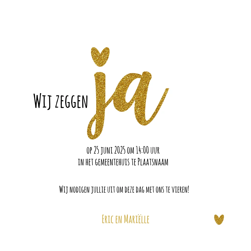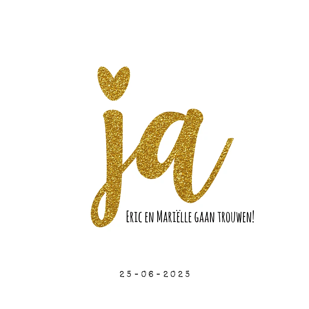 Moderne trouwkaart met goudkleurige glitter Ja en hartje