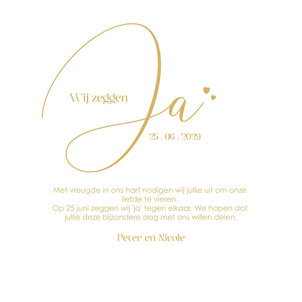 Stijlvolle trouwkaart met sierlijke Ja in goudfolie