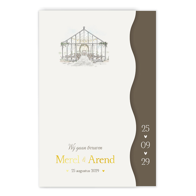 Een stijlvolle trouwkaart met een romantische kas-illustratie en een unieke golvende vorm. De zachte beige tinten en subtiele details zorgen voor een rustige en elegante uitstraling, perfect voor een bruiloft in een kas, serre of landelijke setting.