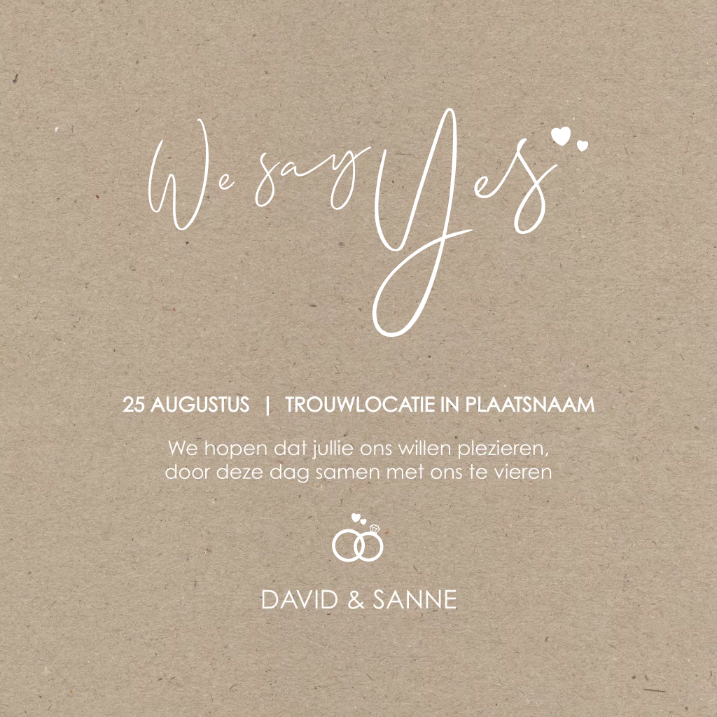 Ontdek de pracht van onze stijlvolle trouwkaart met kraftlook, bedrukt met elegante goudfolie. Deze rustieke en natuurlijke kaart is perfect voor jullie bruiloft in de buitenlucht. Pas de kaart geheel naar wens aan en nodig jullie gasten uit voor een onvergetelijke dag. De combinatie van kraftpapier en goudfolie geeft een unieke en chique uitstraling, ideaal voor een moderne en luxueuze twist aan de klassieke trouwkaart. Deze kaart maakt deel uit van onze exclusieve trouwhuisstijl 'Kraft & Golden Copper'. Creëer een samenhangende look voor jullie hele bruiloft met bijpassende save the date kaarten en bedankkaarten. Kies voor onze duurzame en hoogwaardig gemaakte trouwkaart om jullie bruiloft extra speciaal te maken. Bestel vandaag nog en begin met het ontwerpen van de perfecte uitnodiging voor jullie grote dag.