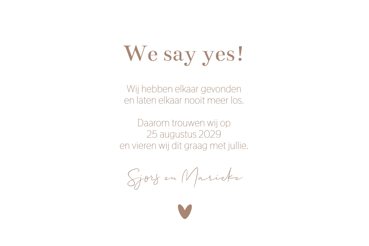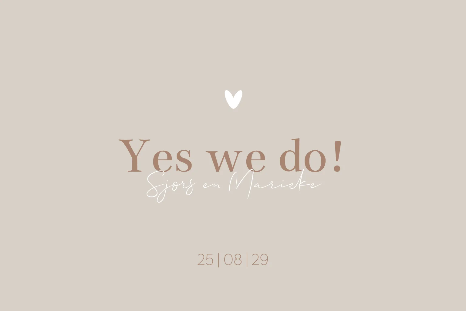 Een stijlvolle minimalistische trouwkaart in een warme mokka beige tint met een rustige, tijdloze uitstraling. Het subtiele hartje en de zachte typografie maken deze kaart perfect voor bruidsparen die houden van eenvoud en sfeer.