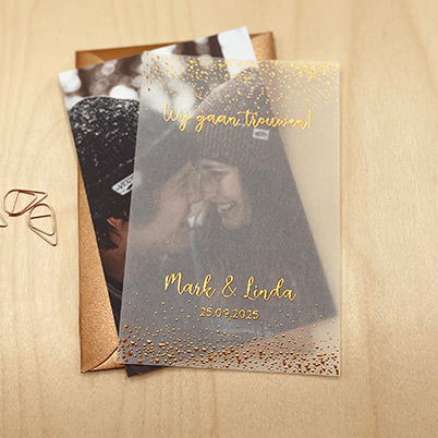 Stijlvolle trouwkaart met een mooi kalkpapieren voorblad met goudfolie bedrukking. Pas de kaart naar wens aan en bestel deze samen met "Trouwkaart kalkpapieren voorkant - stijlvol en hartjes deel 2". Maak beide kaarten met een paperclip of mooi touwtje aan elkaar vast.