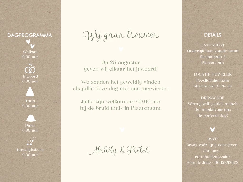 Pas namen, datum en teksten gemakkelijk aan en maak de kaart helemaal naar wens. Ook de kleuren en lettertypes kun je eenvoudig wijzigen.