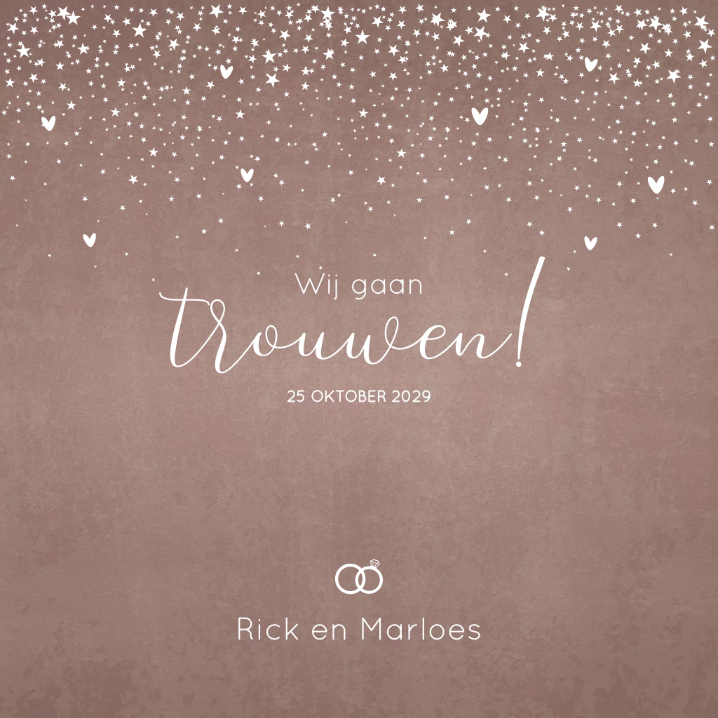 Deze elegante trouwkaart heeft een prachtige velvet-look achtergrond in een moderne bruintint, wat een warme en verfijnde uitstraling geeft. Versierd met sterren die in luxe rosé-goudfolie zijn gedrukt, straalt de kaart een tijdloze charme uit. Perfect voor een bruiloft die warmte en elegantie uitstraalt.