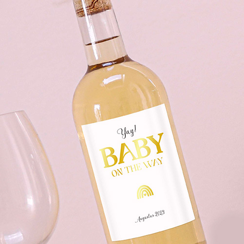 Minimalistisch wijnfles etiket zwangerschap met goudfolie regenboog