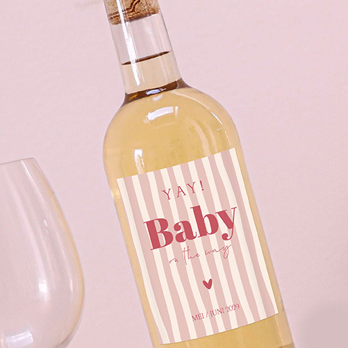 Maak je zwangerschapsaankondiging onvergetelijk met dit speelse wijnfles etiket op een fles wijn! Het ontwerp met zachte roze en crèmekleurige strepen creëert een lichte, vrolijke uitstraling. De opvallende roze-rode tekst geeft een speels en levendig effect, perfect om jouw bijzondere nieuws op een creatieve manier te delen. Dit etiket is volledig aanpasbaar, zodat je het kunt personaliseren met jouw eigen details. Je ontvangt 5 etiketten per vel, ideaal om een fles wijn om te toveren tot een feestelijke verrassing voor familie en vrienden!