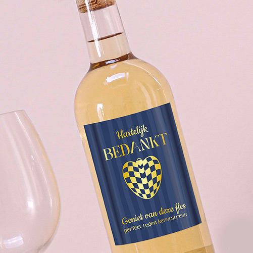 Wijnfles etiket kerst bedankt met blauwe strepen en goudfolie