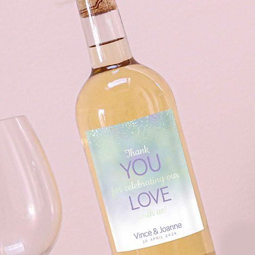 Bedank jullie bruiloftsgasten op een originele manier met een flesetiket in de trouwhuisstijl van jullie grote dag.