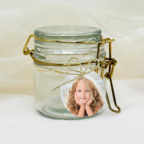 Versier het communiebedankje voor jullie dochter met dit ronde fotolabeltje met een foto en handig ophang gaatje. Klik op de foto om deze te vervangen met je eigen foto. Dankzij het handige gaatje kun je eenvoudig een lint of touw toevoegen en het label aan je bedankjes hangen, zodat je gasten een persoonlijke en stijlvolle herinnering aan de communie mee naar huis kunnen nemen.
