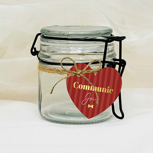Versier de communiebedankjes voor jullie zoon met dit hartvormige labeltje. Dit Labeltje heeft een stijlvol ontwerp met bruinrode sterpen en een goudfolie bedrukking. Als klein detail heeft he labeltje een vlinderstrikje. Pas het ontwerp naar wens aan.