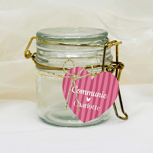 Versier de communiebedankjes voor jullie dochter met dit hartvormige labeltje. Dit Labeltje voor een meisje heeft een stijlvol ontwerp met donker roze en lichtroze strepen wat je naar wens kunt aanpassen.