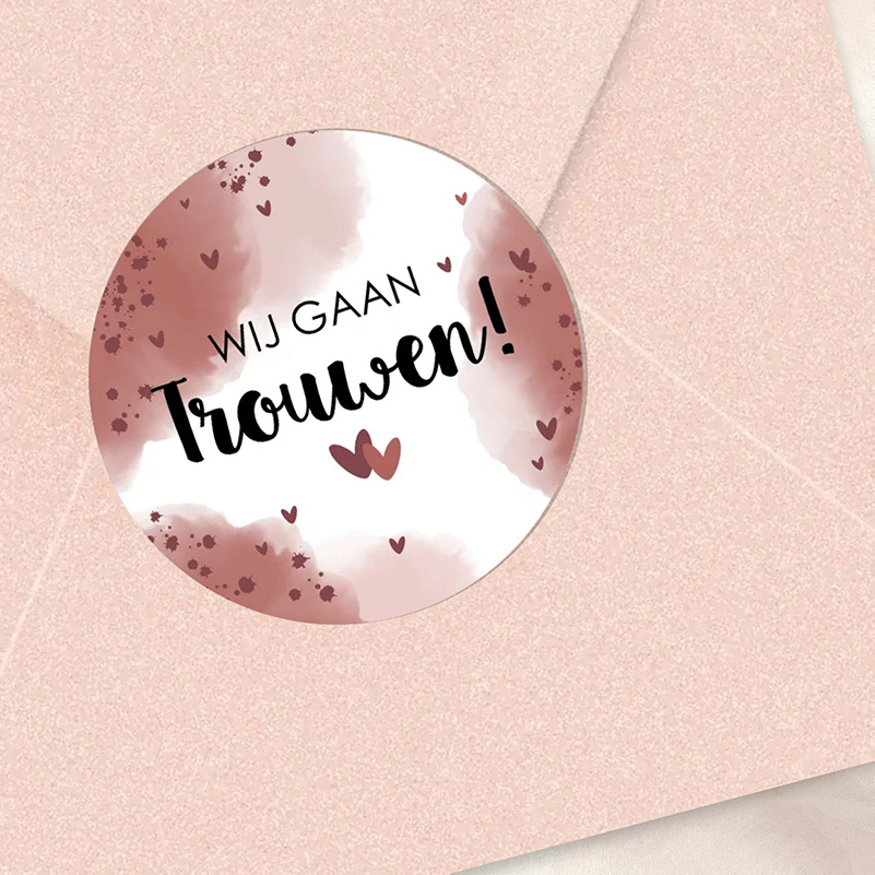 Deze mooie sluitzegel heeft een plum kleurige waterverf look, hartjes en verfspetters. De tekst " Wij gaan Trouwen" kun je zelf eenvoudig aanpassen.