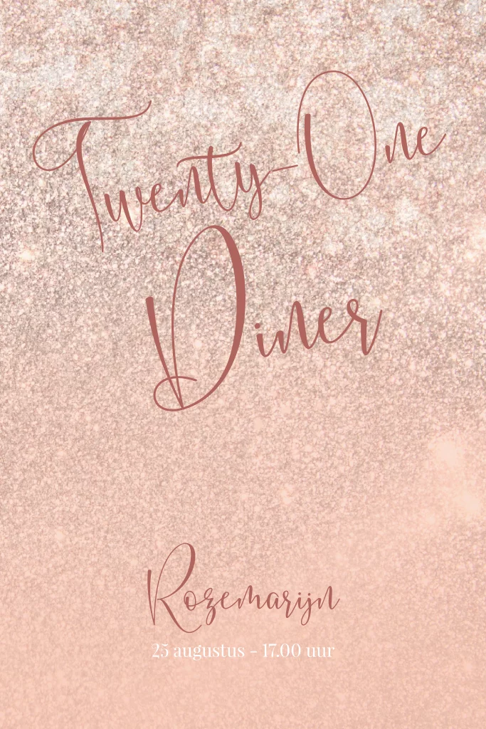 Luxe en romantische uitnodiging voor een 21 diner met een trendy rosé-gouden glitterlook. Perfect voor een stijlvol en feestelijk diner! De sierlijke typografie geeft de kaart een elegante uitstraling. Pas de kaart eenvoudig aan naar wens en bestel een proefdruk om het eindresultaat te bekijken. Maak jouw 21 diner extra speciaal met deze sprankelende aankondiging!
