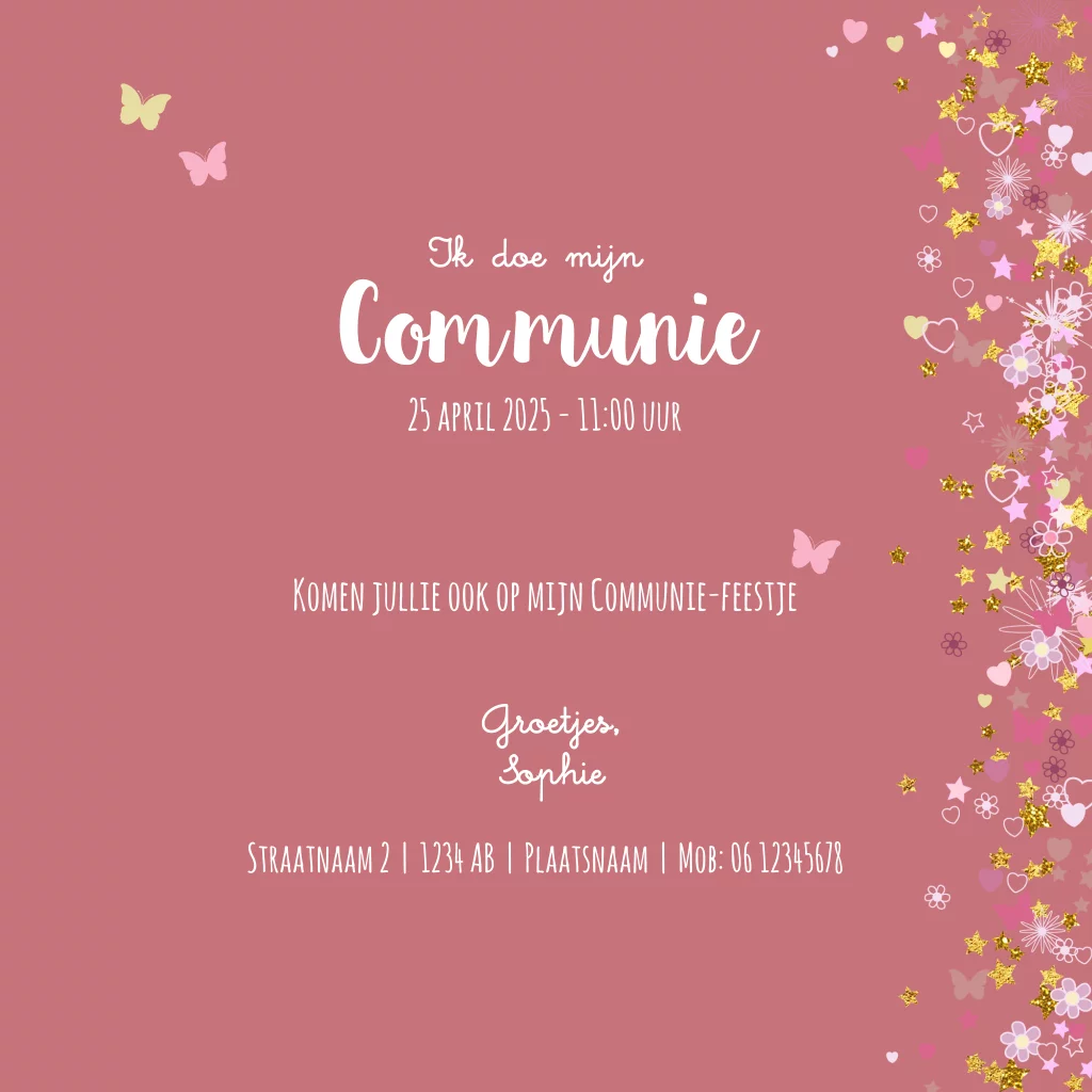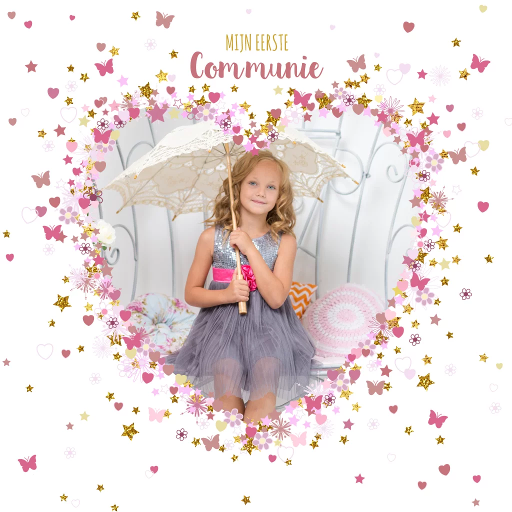 Communie foto uitnodiging hartjes vlinders bloemen en sterren
