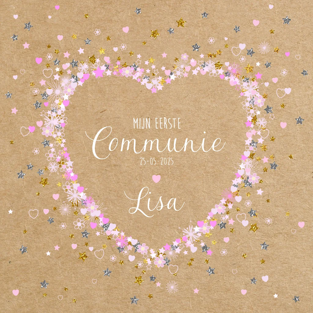 Communie uitnodiging kraft hartjes bloemen en sterren Lisa