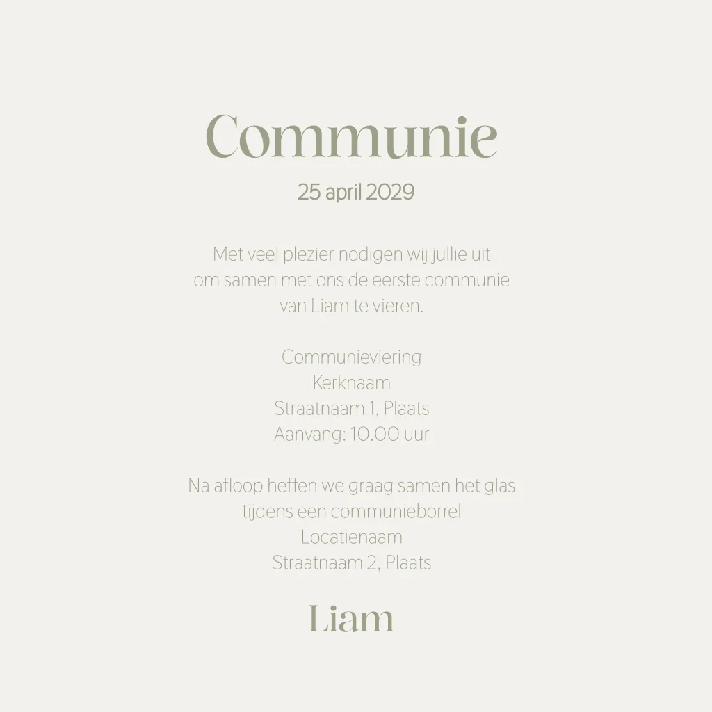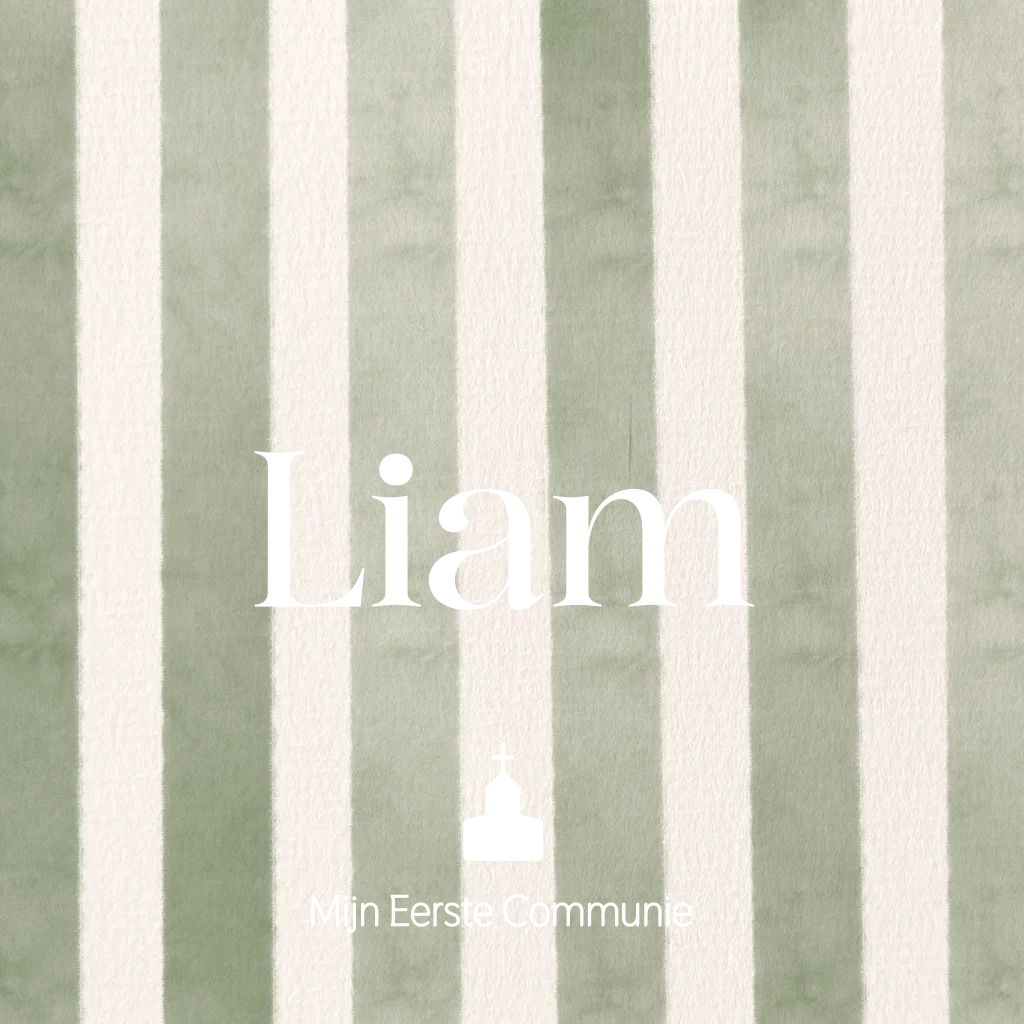 Communiekaart met zachte olijfgroene strepen en verfijnde goudfolie. De rustige kleuren geven de kaart een tijdloze en stijlvolle uitstraling. Op de voorkant staat de naam centraal, gecombineerd met een subtiel goudfolie kerkicoon. Binnenin is ruimte voor een foto en alle details van de communieviering en eventuele borrel.