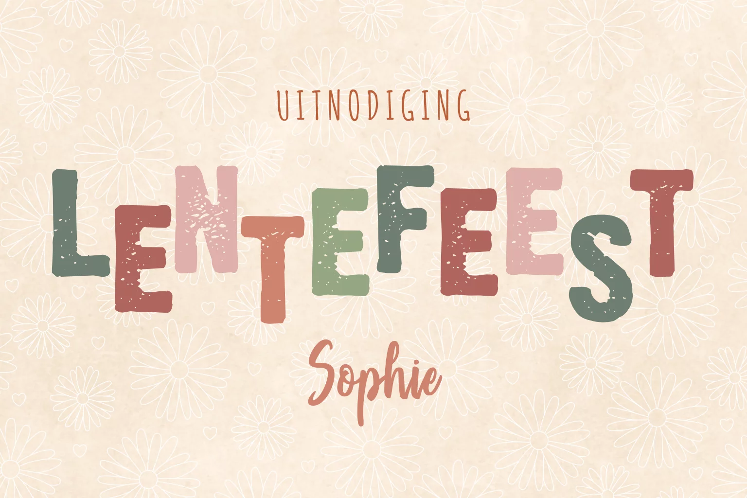 Hippe lentefeest uitnodiging voor een meisje met gekleurde letters met een bloemen patroontje als achtergond. Deze uitnodiging kun je helemaal naar wens aanpassen en zo er jouw unieke lentefeest uitnodiging van maken.