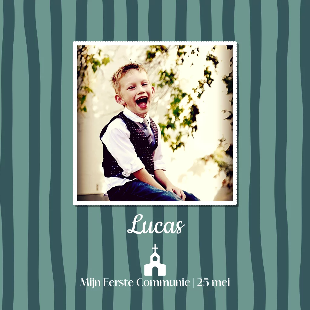 Stoere Communie kaart jongen met groen strepen en foto