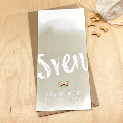 Trendy communie uitnodiging groene waterverf en houten strikje Sven