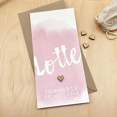 Trendy communie uitnodiging roze waterverf en houten hartje Lotte