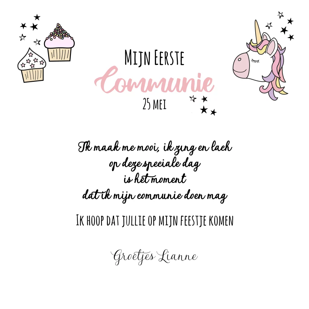 Uitnodiging communie unicorn cupcakes sterren en hartjes