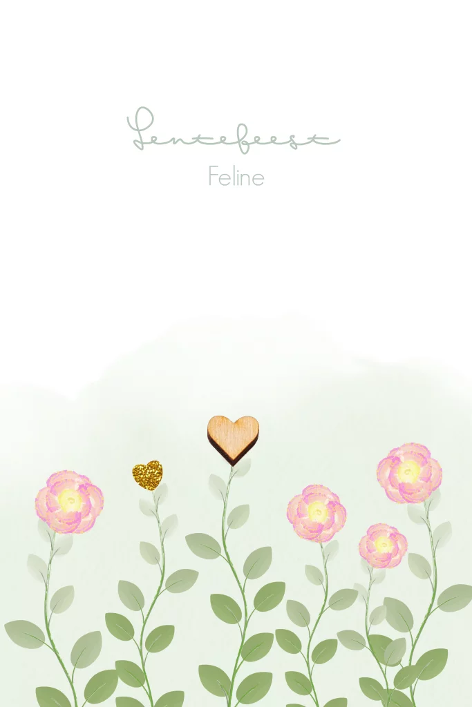 Vier jouw lentefeest in stijl met deze prachtige uitnodiging! Het ontwerp combineert zachte roze bloemenillustraties met een frisse groene waterverf achtergrond. Als extra bijzonder detail kun je een los houten hartje toevoegen, dat je zelf eenvoudig op de kaart plakt.