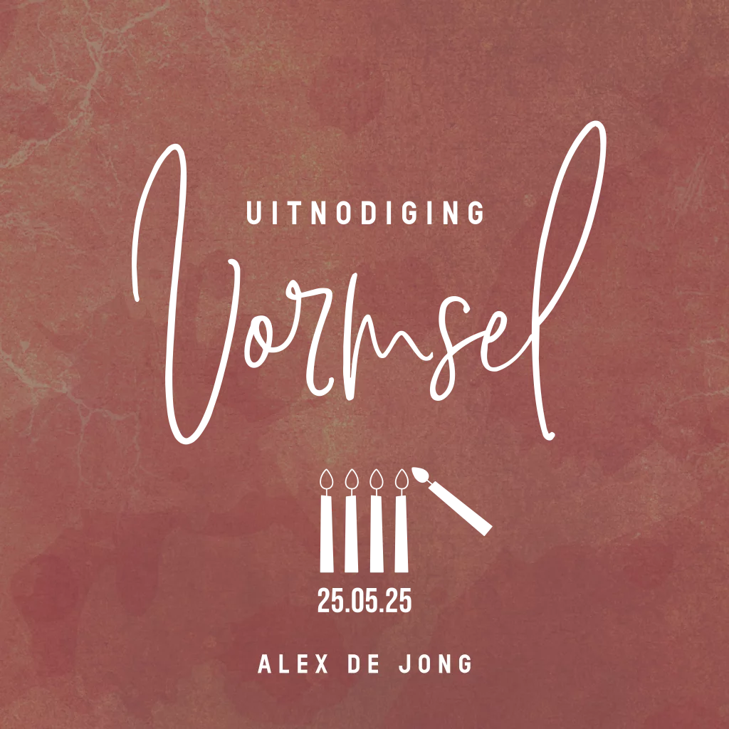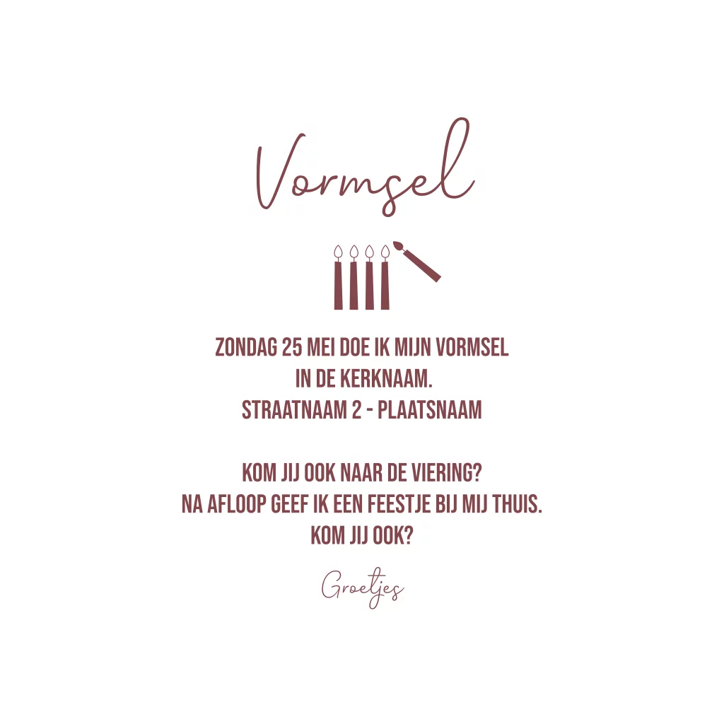 Vormsel uitnodiging met goudfolie. Stoere en trendy uitnodiging in bruin tinten met goudfolie bedrukte tekst en kaarsjes. Je past deze kaart eenvoudig zelf aan in onze handige editor.