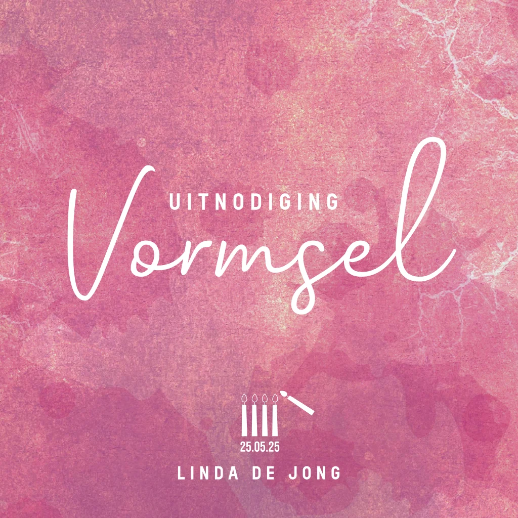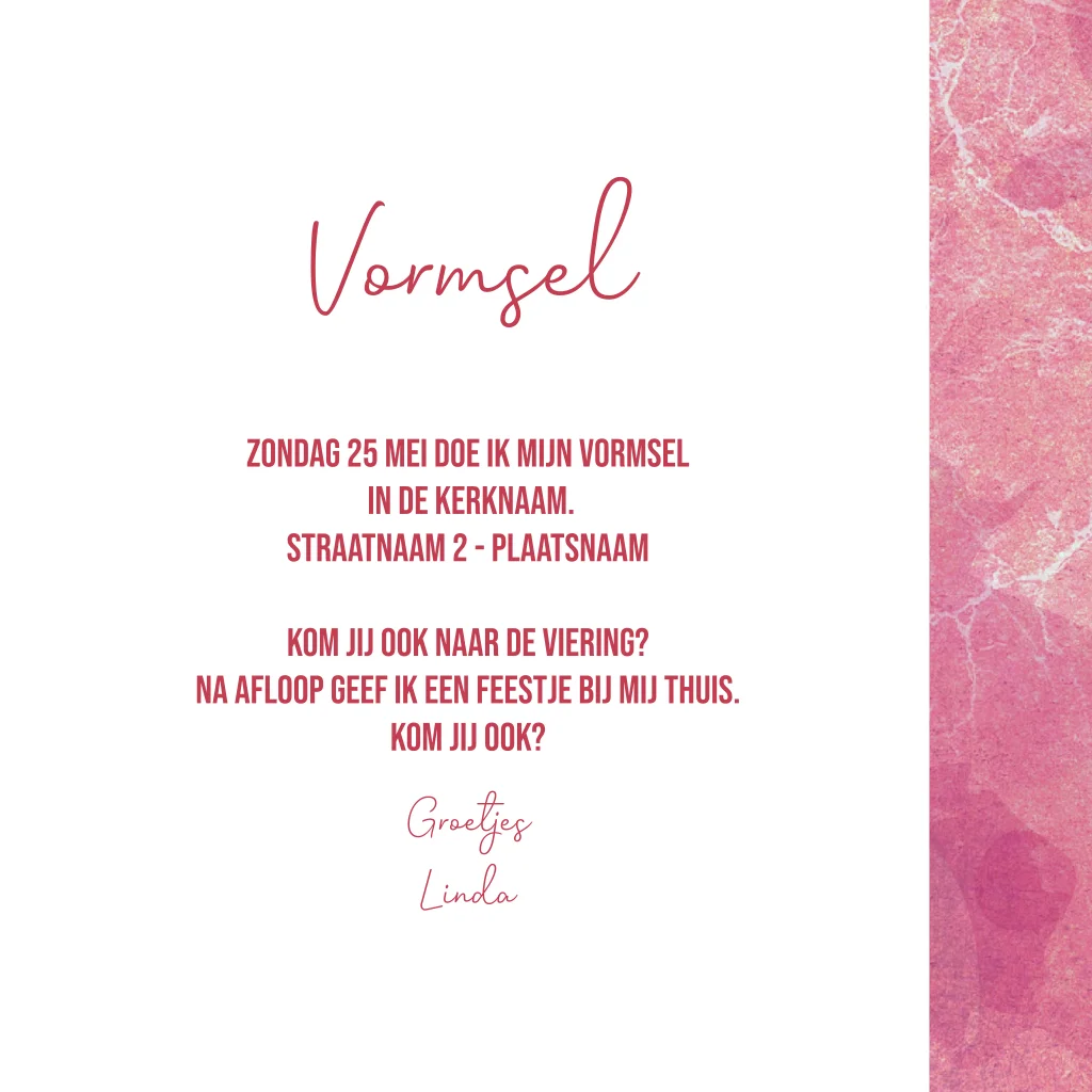 Vormsel uitnodiging voor meisjes. Deze stoere roze kaart heeft een stoere gestructureerde achtergrond. De teksten kun je eenvoudig aanpassen.