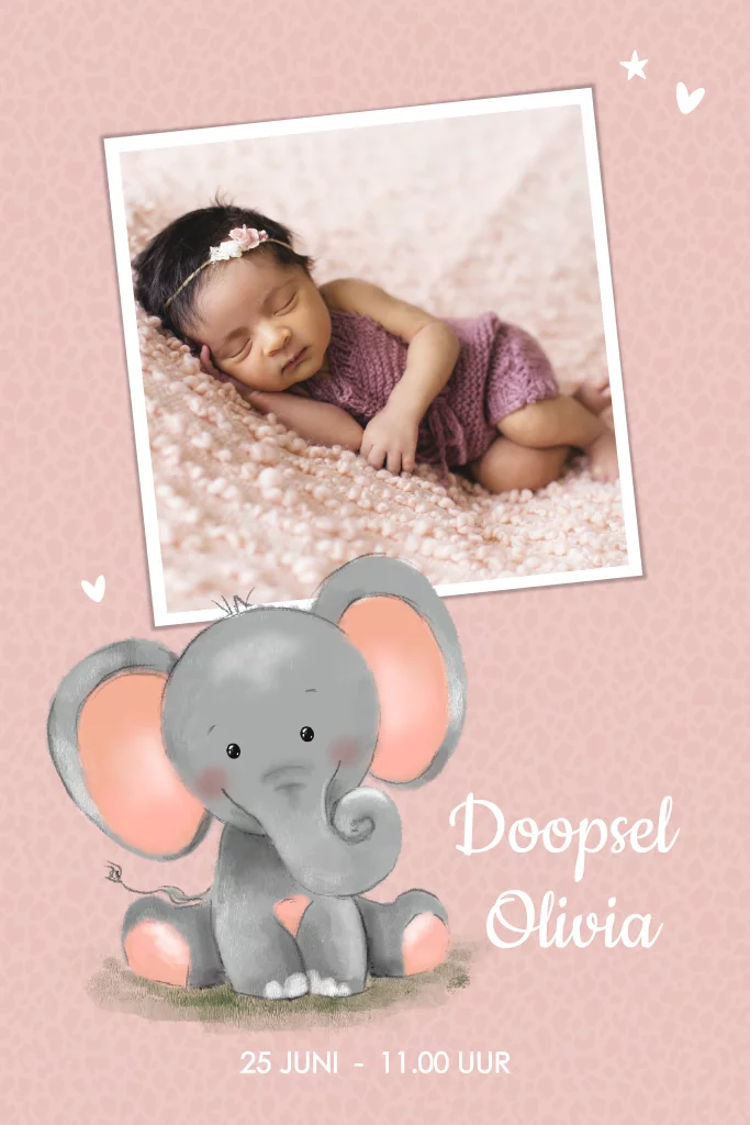 Schattige doopkaart in oudroze met een subtiele panterprint en een schattig olifantje. Voeg eenvoudig een foto van je baby toe en pas de teksten naar wens aan. Maak deze uitnodiging persoonlijk en uniek. Bestel een proefdruk om het perfecte resultaat te garanderen!