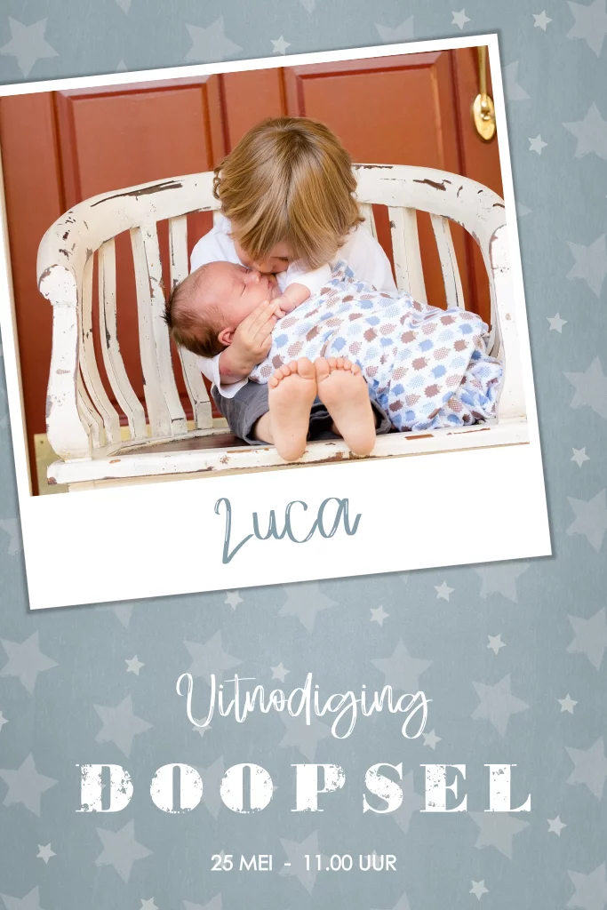 Stijlvolle en stoere doopkaart voor een jongen in een prachtig blauw thema met sterren. Voeg eenvoudig je eigen babyfoto toe en pas alle teksten naar wens aan. Maak deze uitnodiging uniek en persoonlijk. Bestel nu een proefdruk om het perfecte resultaat te garanderen!